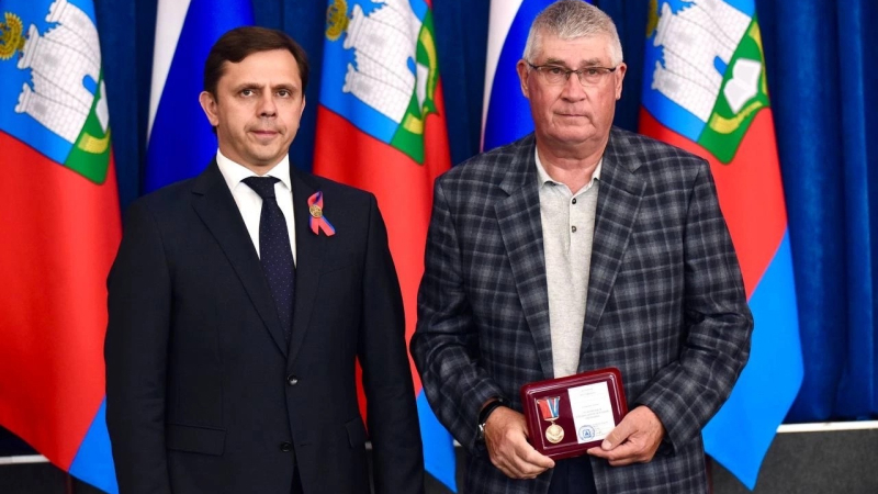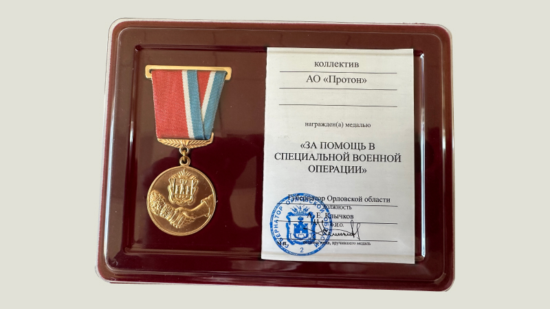 В торжественной обстановке Губернатор Орловской области Андрей Клычков вручил медаль «За помощь в специальной военной операции» представителю коллектива АО «Протон» генеральному директору Вячеславу Меньшову.